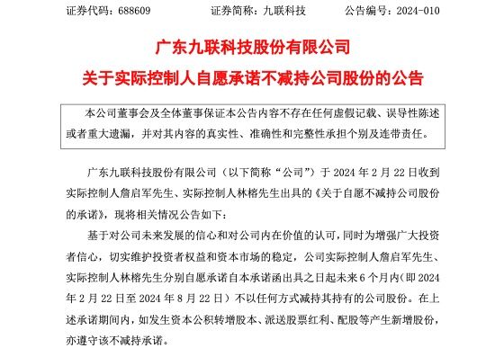 公告称,基于对公司未来发展的信心和对公司内在价值的认可,同时为增强广大投资者信心,切实维护投资者权益和资本市场的稳定,公司实际控制人詹启军先生、实际控制人林榕先生分别自愿承诺自本承诺函出具之日起未来6个月内(即2024年2月22日至2024年8月22日)不以任何方式减持其持有的公司股份。在上述承诺期间内,如发生资本公积转增股本、派送股票红利、配股等产生新增股份,亦遵守该不减持承诺。