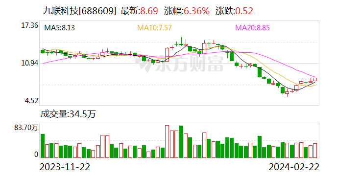 同日,九联科技发布2023年度业绩快报,期内营业收入约21.7亿元,同比减少9.67%;归属于上市公司股东的净利润亏损约1.99亿元;基本每股收益亏损0.4029元。