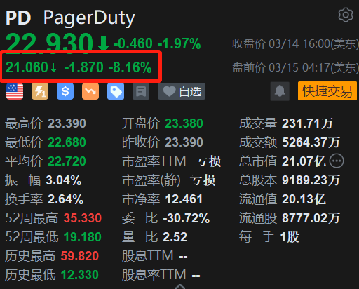 云计算公司Pagerduty(PD.US)盘前跌8.16%,报21.06美元。公司截至1月31日的24年第四财季收入为1.111亿美元,高于去年同期的1.01亿美元。该公司预计25年的收入为4.7亿美元至4.78亿美元,低于市场预计的4.809亿美元。