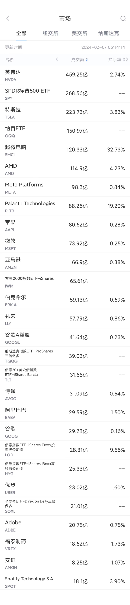周二美股成交额第1名英伟达收跌1.6%,成交459.25亿美元。该公司将在2月21日公布业绩,高盛与美银均将其目标价上调至800美元。
