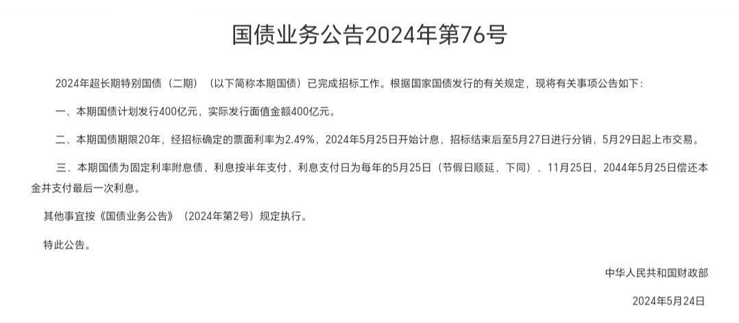 5月24日,财政部发布的国债业务公告显示,2024年超长期特别国债(二期)已经完成招标工作。本期国债为20年期固定利率附息债,实际发行面值总额400亿元,中标利率2.49%。招标结束后,5月27日进行分销,5月29日起上市交易。